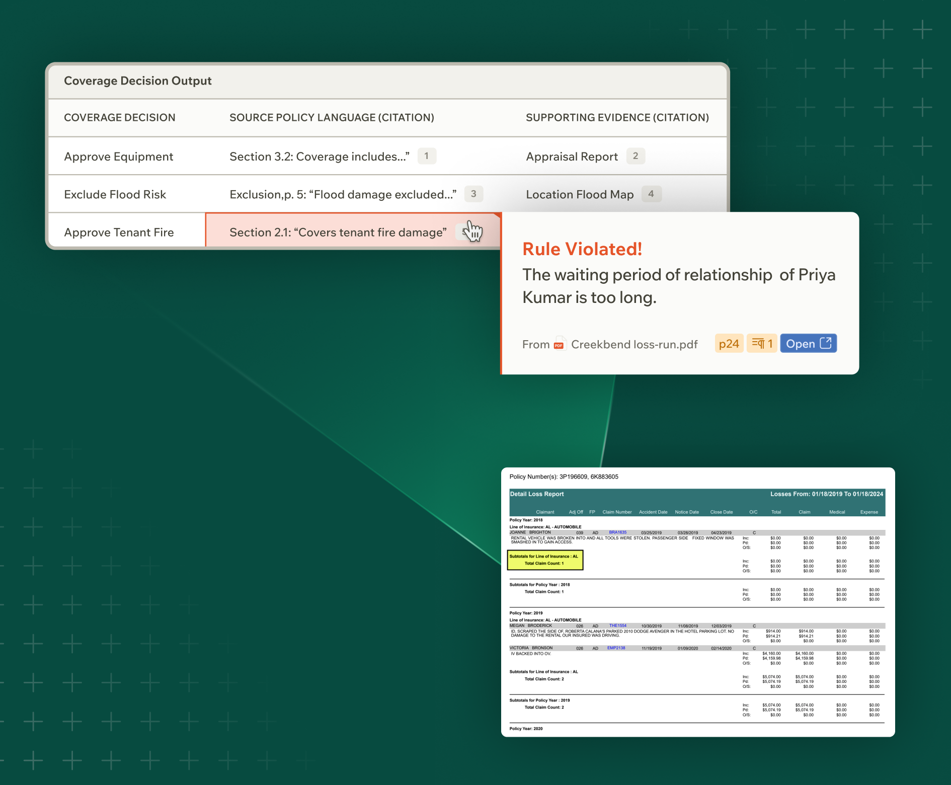 Turn FNOL packets, estimates, & police reports into a structured, searchable claim file on the first pass. Key facts & amounts are captured automatically with source citations to speed coverage & liability decisions.