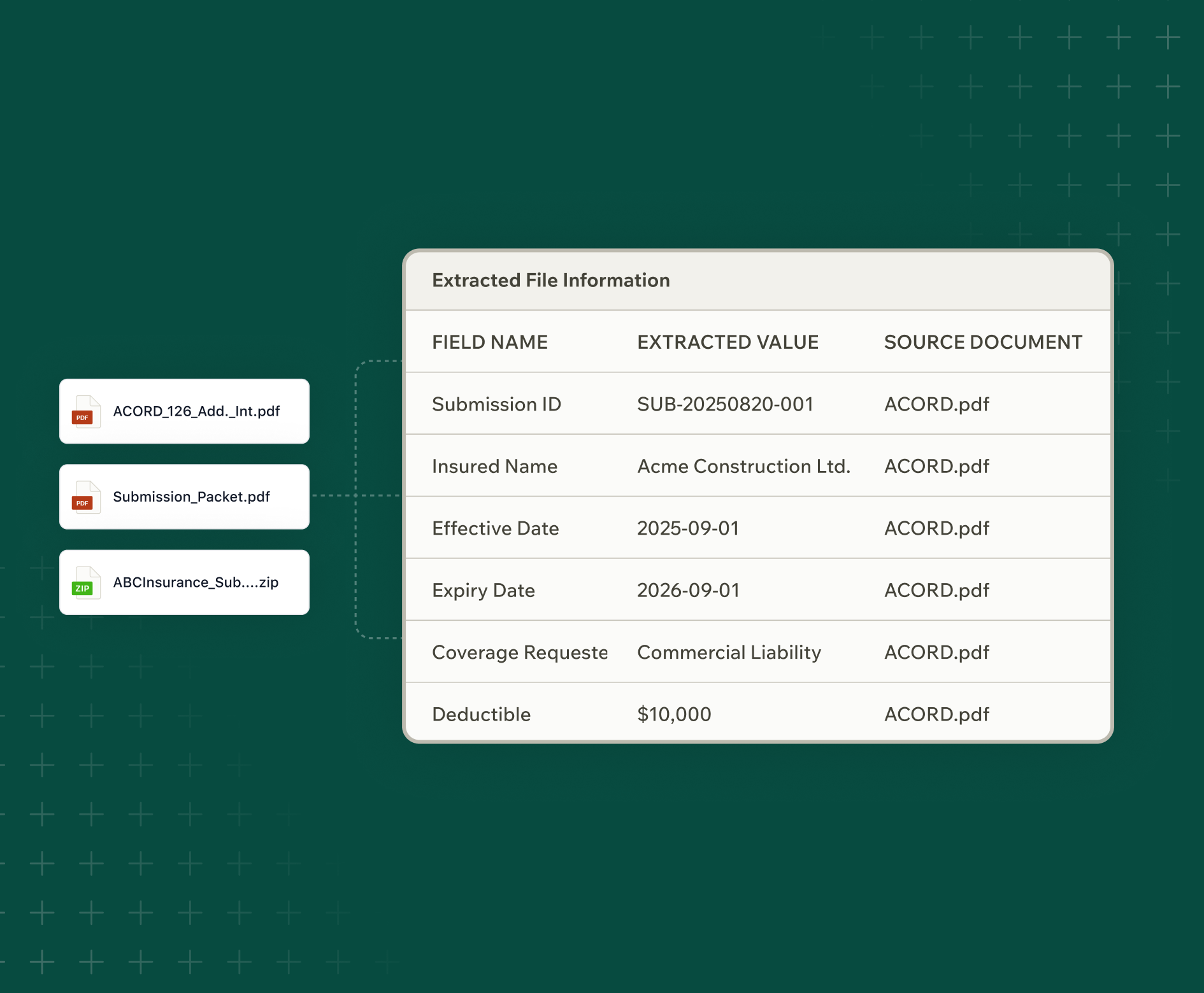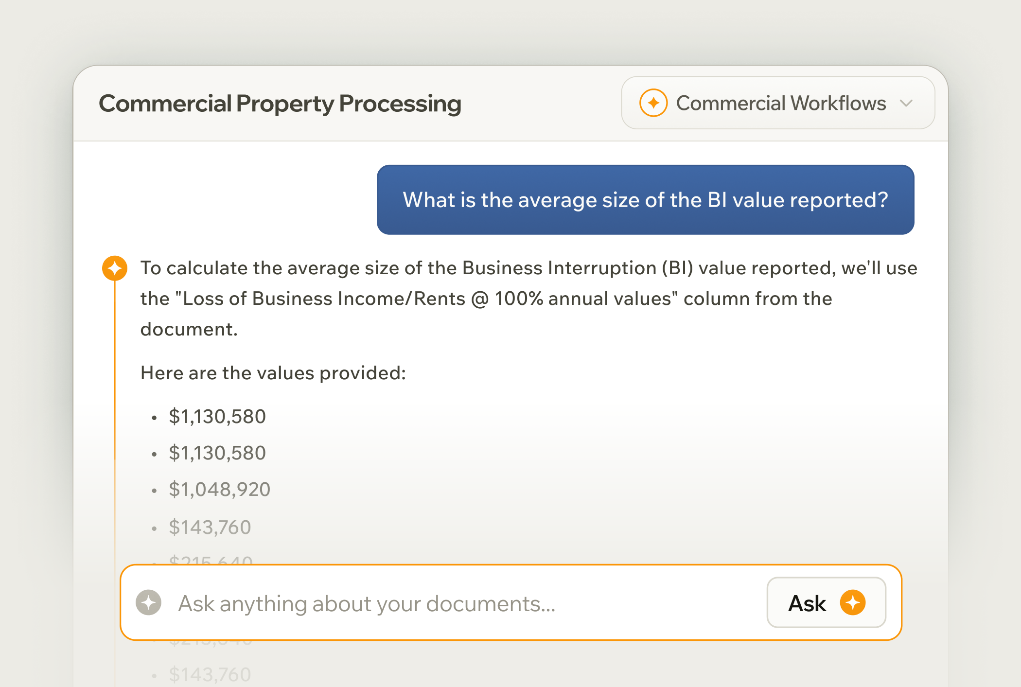 Process property schedules & SOVs, evaluate catastrophe exposures & risk concentrations, compare coverage terms & endorsements automatically.
