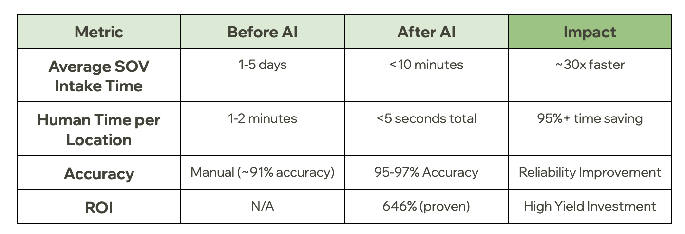 • 1–5 days per SOV were consumed in processing—causing delayed quotes, strained broker relationships, and lost opportunities.