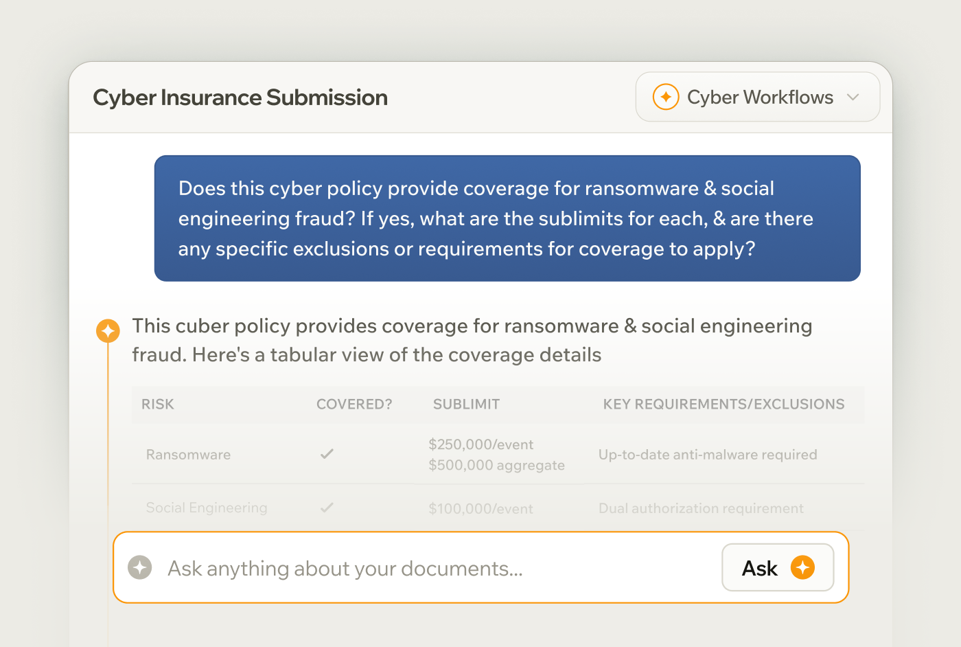 Turn messy cyber applications into structured risk data instantly. Extract & verify critical controls—MFA, EDR, backups, segmentation—with automated gap detection.