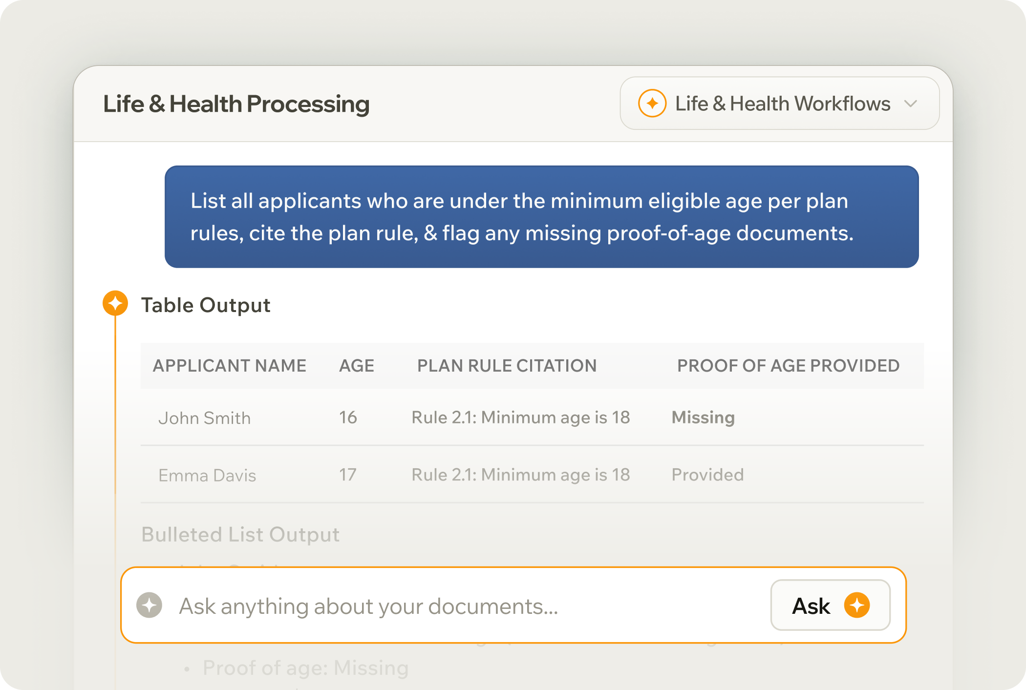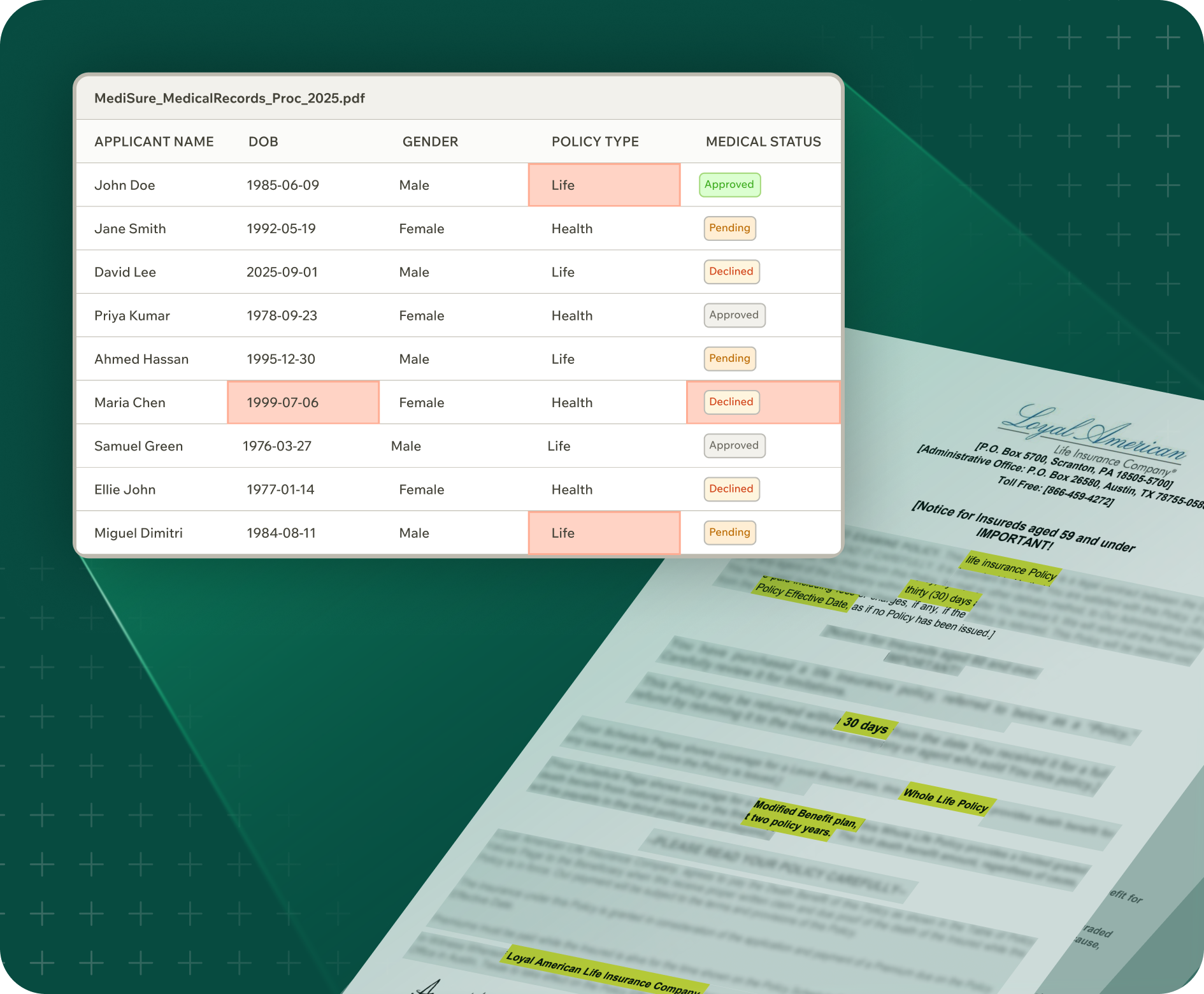 Turn applications, census files, & medical evidence into validated underwriting packets. Flag missing data & assemble complete case files.